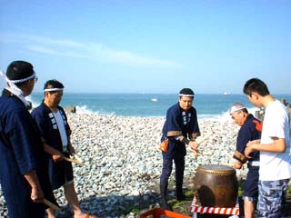 お祭の始めに海まで清めの海水を採りに行きます、ただ取に行くだけでなくトッラクに太鼓や鐘,御輿をのせ、太鼓をたたきながら出かけます。